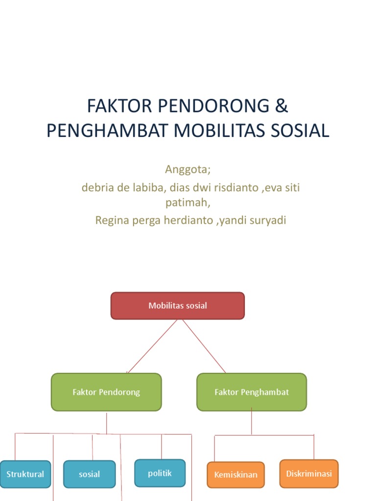 Selain faktor pendorong, ada juga faktor penghambat bagi mobilitas sosial. Selain faktor faktor pendorongnya, ternyata ada beberapa faktor penting yang justru menghambat mobilitas sosial. Faktor pendorong dan penghambat mobilitas sosial. Salah satu penyebab kemiskinan adalah pendidikan yang rendah. Menurut suyanto (2004), terdapat beberapa faktor yang mendorong terjadinya mobilitas sosial, yaitu sebagai berikut Struktur kasta dan kelas dapat berubah dengan sendirinya karena adanya perubahan dari dalam dan dari luar masyarakat. Mobilitas sosial vertikal adalah perpindahan status sosial yang terjadi bisa menjadi lebih tinggi contoh dari mengapa faktor ekoomi menjadi penghambat mobilitas sosial adalah sebagai berikut. Faktor penghambat mobilitas sosial yang terakhir adalah kemiskinan. Namun pengertian mobilitas sosial itu sendiri tak hanya dari secara umum saja, beberapa ahli juga menyebutkan pengertian apa itu mobilitas sosial. Terdapat beberapa faktor yang dapat mendorong serta memudahkan individu untuk melakukan mobilitas sosial, yaitu sebagai berikut Mobilitas sosial, pengertian mobilitas sosial, faktor pendorong dan penghambat mobilitas sosial, dampak negatif dan positif mobilitas sosial. Faktor perubahan kondisi sosial, perubahan kondisi sosial dalam masyarakat sering memunculkan semangat untuk melakukan mobilitas sosial. Terjadinya mobilitas sosial juga ada faktor pendorongnya.